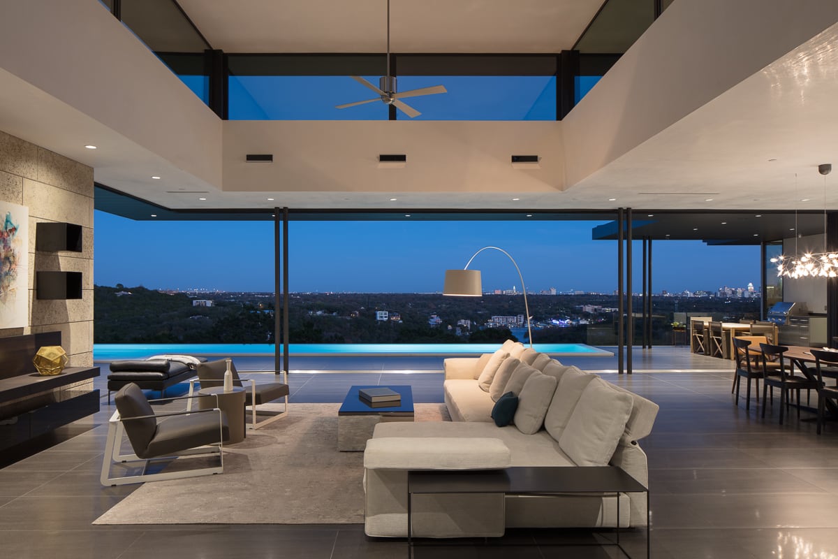 Inside, the open floor plan is designed to perfection, combining opulence with warmth. The state-of-the-art chef’s kitchen, anchored by a sprawling center island, features top-tier finishes and appliances, ideal for both intimate gatherings and grand-scale entertaining. The heart of the home boasts 58 feet of floor-to-ceiling glass, which retracts entirely to reveal a stunning outdoor sanctuary complete with an award-winning infinity pool, spa, outdoor kitchen, and elegant living spaces—all seamlessly blending into the rugged beauty of the Texas Hill Country.